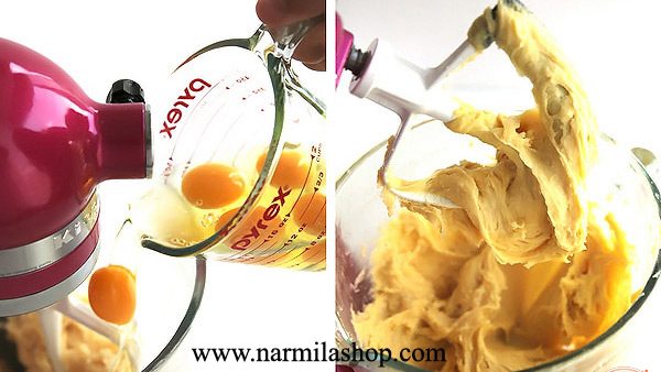 ۳-حدود ۱۰ دقیقه خمیر را با حرارت ملایم تفت دهید تا خمیر بپزد سپس قابلمه را از روی حرارت بردارید و پس از اینکه خمیر خنک شد تخم مرغ ها را به نوبت اضافه و خوب مخلوط کنید تا خمیری نرم و لطیف بدست بیاید.